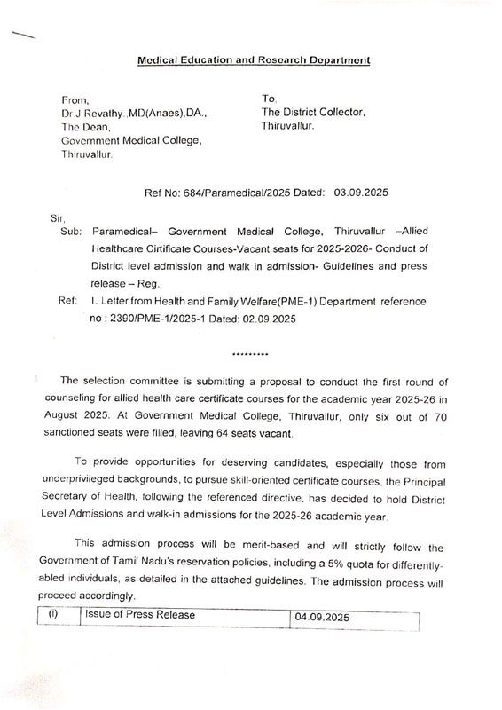 ALLIED HEALTH SCIENCES CERTIFICATE COURSE REPORT OF VACANT SEATS - Click Here